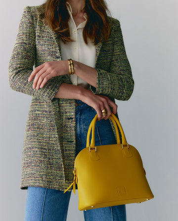 Handbag Elegant, classic and timeless leather Leandra yellow with long adjustable strap with cufflinks and removable, to carry it cross-body or adjustable to the shoulder.Women's handbagThe perfect size for everyday wear and evening looks. Matching finish, printed resin-coated twill leather interior, zipper closure, and the brand logo engraved on the front of the bag. It has two interior pockets, one zippered in leather and the other flat in leather. Discover the handbags Leandra yellow leather bag!