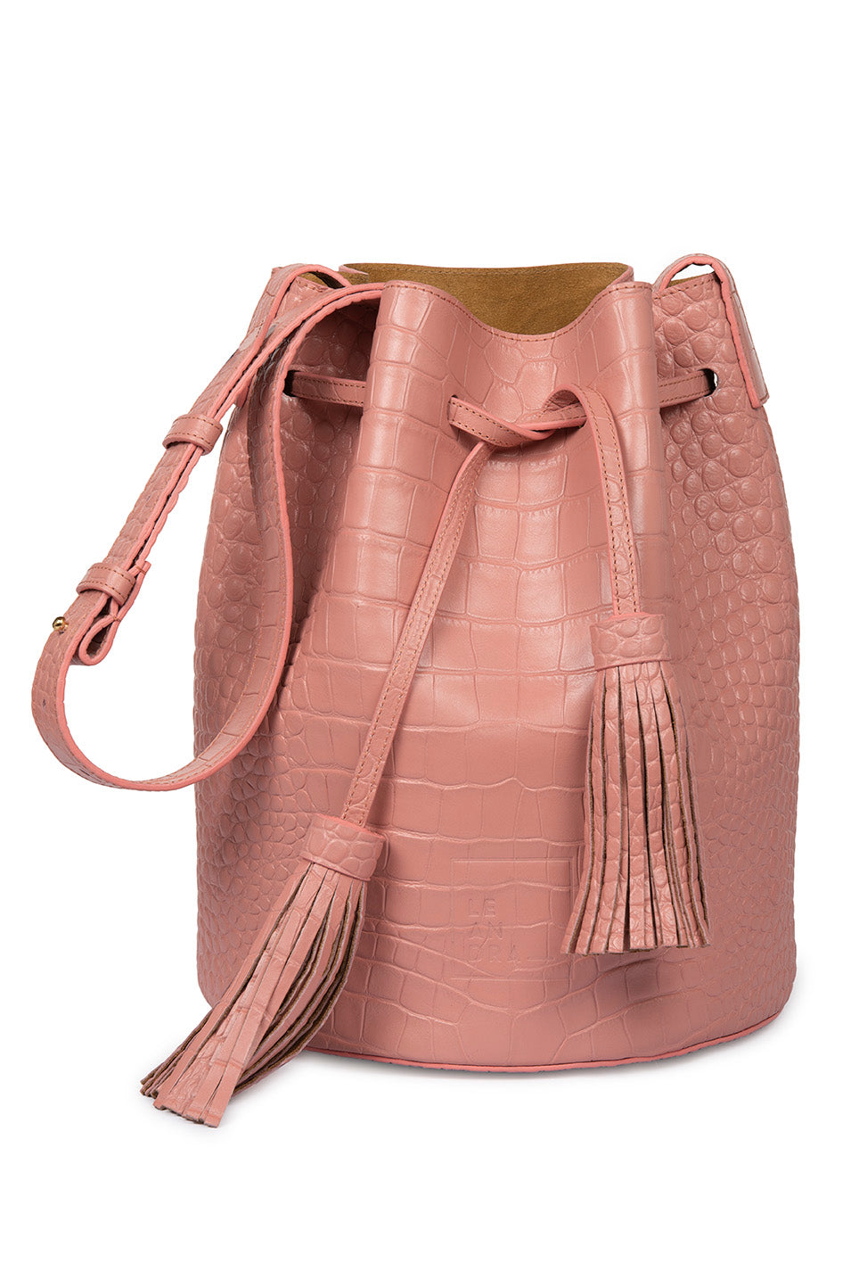Leather sack or bucket bag embossed in soft pink coconut with a removable pocket and two-tone tassels in nude Leandra.Casual, functional and elegant, thecomplementessential in your wardrobe. Thesack bagPink, it has everything you need to make your look simply perfect, now embossed in soft coco. Its two-tone tassel will add movement and style to your outfit. Leandra pink embossed leather bucket bag, 100% soft coco.Made in Spainfor sale at leandrabrand.com