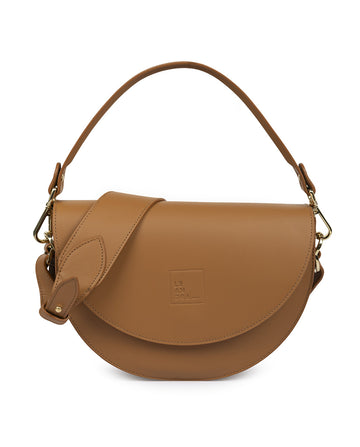 Bandolera de piel tipo saddle bag color caramel fabricada en España con asa de mano y asa larga extraíble y regulable con gemelos. Lujada al tono, piel interior en piel serraje vacuno color nude, cierre tipo imán y logo de la marca grabado en el frontal del bolso. Dispone de bolsillo interior.